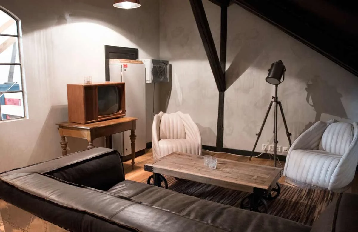 I midtpartiet av rommet, der det er godt egnet for vrimleområde, finner du baren. Taket er dekorert med håndskårne skiver av helved og veggen bak baren har fått montert svarte og hvite eikefinérhyller. Titalls Norgesglass-lamper henger fra taket, og lys i de møbelsnekrede hyllene sørger for en spennende atmosfære. Baren er omgitt av små, intime lounge-rom med gode sitteplasser og gamle bøker i skinn. Her finner de besøkende blant annet litterære klassikere og historiske verk. På veggene henger det moderne fotokunst.